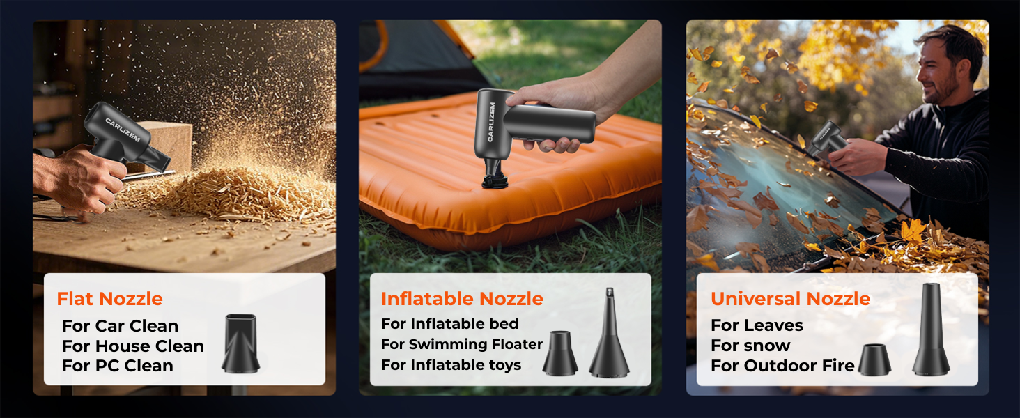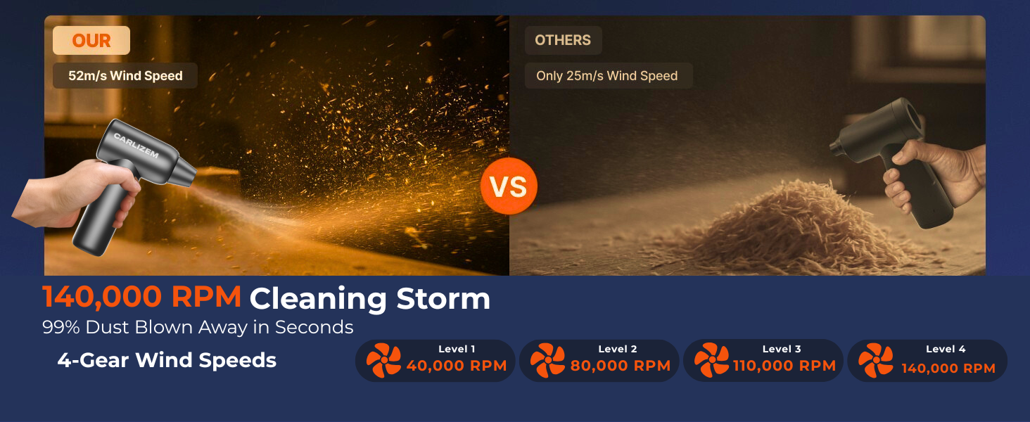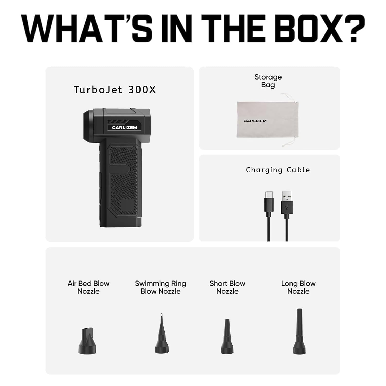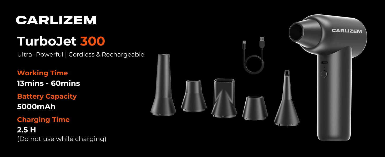 Introducing the Carlizem TurboJet 300 – a pocket-sized powerhouse designed to blow away the competition. With an insane 140,000 RPM brushless motor and powerful wind pressure, this cordless electric air blower delivers industrial-grade performance in a sleek, handheld design. Whether you’re blasting dust from keyboards, detailing your car, or drying surfaces fast, the X-Jet is your all-in-one tool. No more bulky air dusters. No more disposable air cans. Just pure, precision-controlled air force — when and where you need it. With 4 speed modes, USB-C charging, and a lightweight 205g build, the TurboJet is made for everything from home cleaning to outdoor utility. 140,000 RPM Motor – Blazing fast and shockingly powerful 180g Wind Pressure – For deep cleaning and fast drying Cordless & USB-C – Portable, rechargeable, hassle-free Multi-Use Tool – Ideal for car cleaning, electronics, DIY & more Eco-Friendly Alternative – Say goodbye to air cans forever
